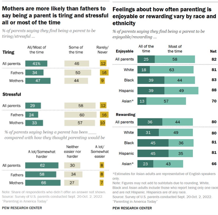 Of course we need to improve parents’ circumstances. One of our motivations for starting Joyful Parenting was a Pew Research study on disparities in the enjoyment of parenting: Moms are more likely than dads to say that they find parenting tiring or stressful all or most of the time, and Asian Americans tend to find less enjoyment and fulfillment from parenting compared to people of other ethnicities. The report suggests this might be due to higher stress levels over children’s outcomes and the pressures of intensive parenting. Similarly, mothers are more likely than fathers to find parenting stressful and tiring than fathers.